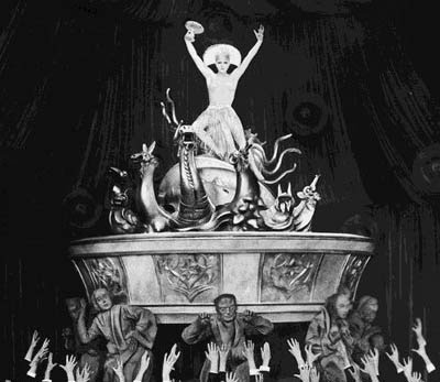 En un momento clave del baile aparecen 5 luces, el pentagrama arriba. El ritual empieza con las putas de rojo reptando , tiradas en el suelo, como víboras,como serpientes.