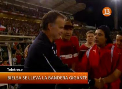 -La bandera que recorrió el estadio con la inscripción "Don Marcelo Bielsa, Chile le agradece" se la entregaron en el banco de suplentes y el rosarino saludó a cada uno de los portadores de la misma.