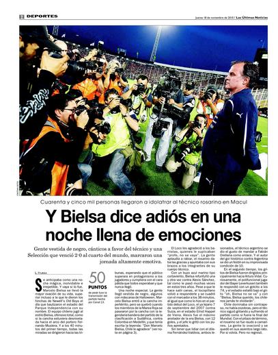 El rosarino guió un exitoso proceso al mando de la "Roja" con 27 triunfos y 15 derrotas.Marcelo Bielsa se despide esta tarde de su condición de director técnico de la selección chilena con un rendimiento de 59,9 % de rendimiento, uno de los procesos más exitosos en la historia.Con el duelo de hoy ante Uruguay en el estadio Monumental, el rosarino completará 50 partidos al mando de la cabina técnica de la "Roja". Hasta hoy, en 49 presentaciones, ha cosechado 27 victorias, 7 empates y 15 derrotas. El mejor rendimiento de Chile fue en las eliminatoras al mundial de Sudáfrica con un 61% (10 PG, 3PE y 5PP), para conseguir el segundo lugar del subcontinente tras Brasil; mientras que en la cita africana el índice alcanzó el 50% (2PG y 2PP). En amistosos, en tanto, fue de un 60,5% (15 PG, 4PE 8PP).