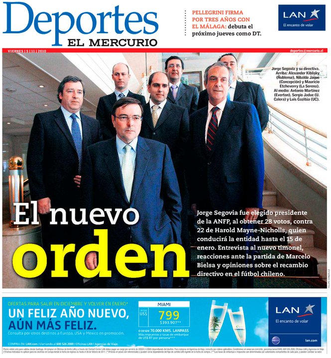 El empresario español y presidente de Unión Española, Jorge Segovia, se convirtió este jueves en el nuevo timonel de la Asociación Nacional de Fútbol Profesional (ANFP) tras imponerse por 28 votos, ante 22 conseguidos por Harold Mayne-Nicholls. Segovia, integrante de la lista A, obtuvo cuatro votos por parte de la Primera B y 24 de Primera División. El hispano dirigirá el balompié nacional del 15 de enero de 2011 hasta el año 2015. Por su parte, Mayne-Nicholls, consiguió 10 votos de la Segunda División y 12 de la serie de honor. Vale precisar que los sufragios de los presidentes de Primera A valen el doble.