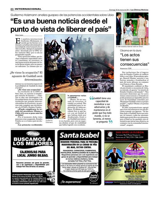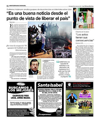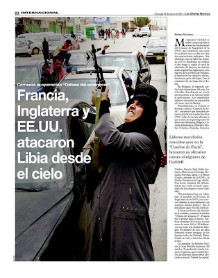 1) Las tropas, tanques y aviones de Kadafi, son "máquinas de asesinar a civiles". 2) Los misiles, las bombas inteligentes, los cazas bombarderos, los submarinos y los portaaviones de la coalición imperial son instrumentos democráticos de "paz y liberación" Obama dice que la misión en Libia salvó "incontables" vidas. Kadafi somete y mata, la coalición imperial libera y protege.Estas dos fronteras conceptuales (impuestas psicológicamente) marcan el tratamiento y la valoración de las "noticias" sobre Libia.Y conforman el eje central (encubierto) de la manipulación mediática que la prensa internacional utiliza día y noche para ocultar o deformar la compresión estratégica de lo que realmente está sucediendo en Libia.Un país sometido primero a una "revuelta popular" digitada desde afuera para derrocar al gobierno, a una "rebelión" armada con toma de ciudades después, y finalmente a una intervención militar internacional con bombardeos ininterrumpidos con muerte de civiles inocentes desde hace siete días.